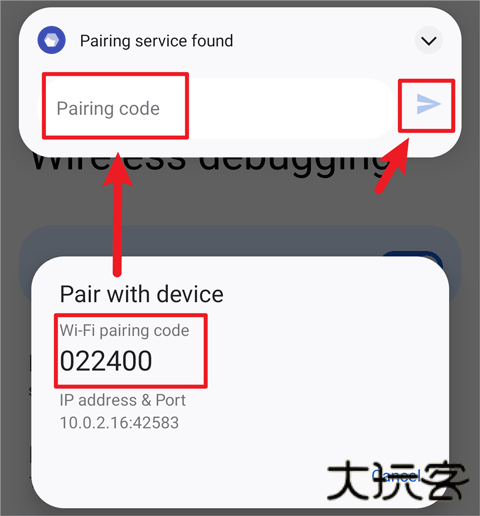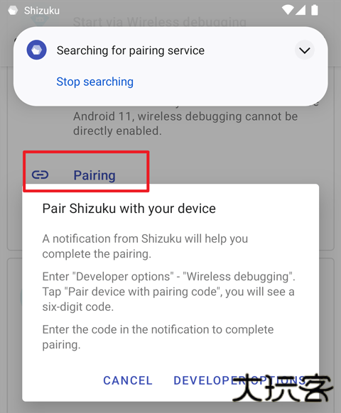 4、手机会显示一个配对码,Shizuku 会弹出通知询问,在这个通知里填入看到的配对码