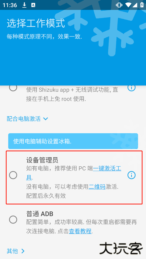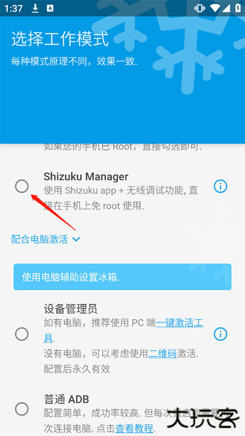想用冰箱冻结后台应用?启动前需要激活相应模式。Root 设备最简单,直接 Root 模式启动冰箱即可。没 Root 的朋友,推荐用 Shizuku app 或连接电脑激活,操作也不算复杂。