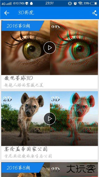 3、 进入 “3D 影院” 频道后,你会发现这里每周都会更新推荐一些 3D 短片或电影。随便选择其中一部你想看的点击播放即可。耐心等待影片加载完成(看进度条),软件这时就会自动开启 3D 播放模式开始立体放映了,这个过程很便捷