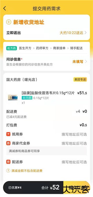 如没有处方但急需用药:点击提示中的「在线问诊」,在美团互联网医院页面选择在线医生视频 / 图文沟通病情;医生评估后若判断需要该药,会开具电子处方。