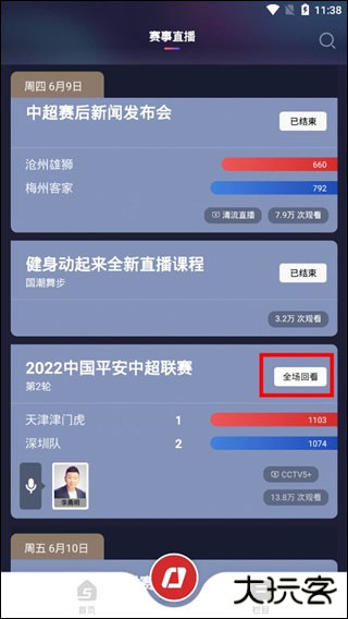 2、进入直播赛事列表后,选择显示 “全场回看” 字样的目标比赛。