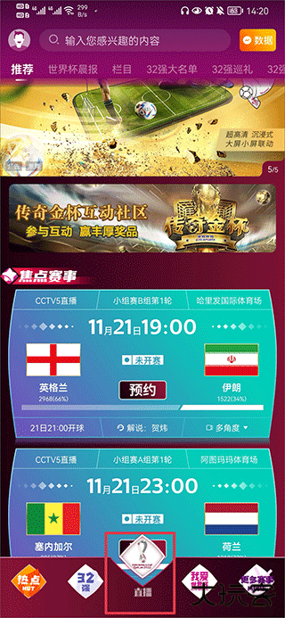 1、启动世界杯官方 App,首页下方点击 "直播" 入口。