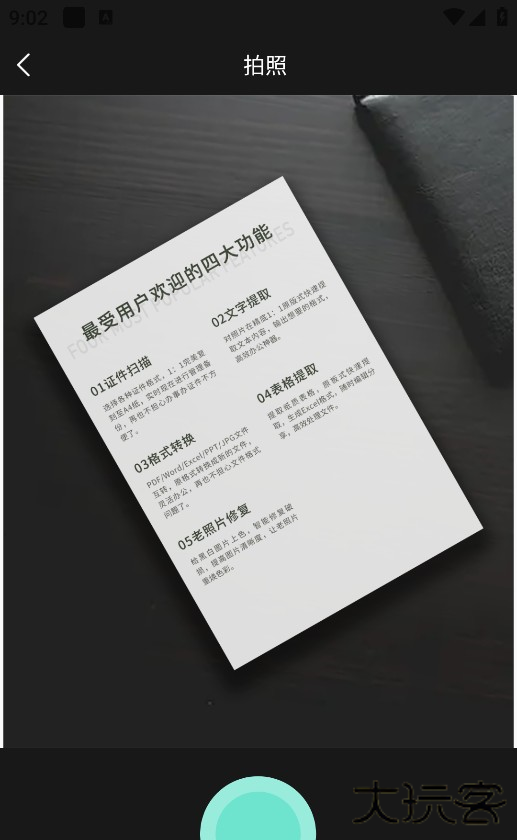 1、拍摄文档、票据、图纸等七类内容,自动清除背景干扰,输出 JPEG 或 PDF 高清文件 。