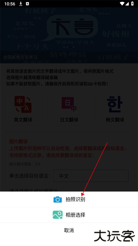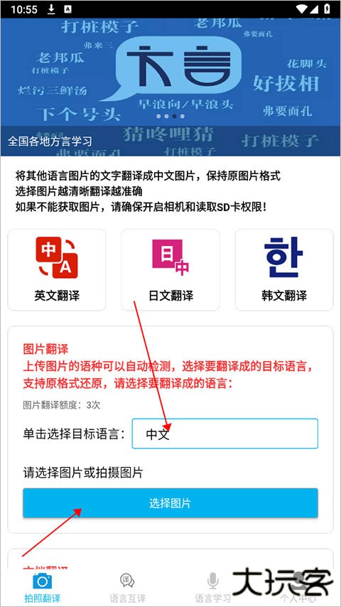 2、点击 “选择图片” 功能键。此步骤可选择,通过拍照实时获取需翻译内容画面或者直接选取手机相册中已存在的图片进行翻译操作。