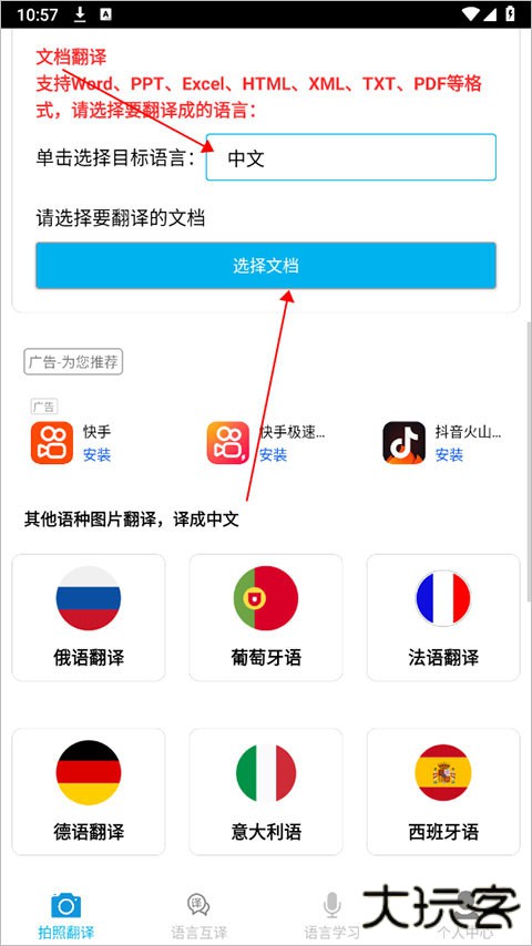 2、点击 “选择文档” 功能选项。随后,从手机存储中选择需进行翻译操作的文档文件。