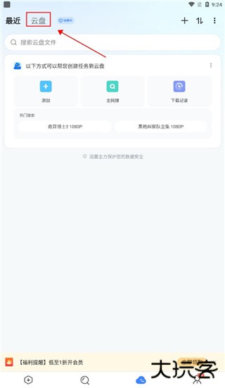 1、在手机桌面轻触 "迅雷" 应用图标启动程序,进入应用主界面后点击底部导航栏的 "云盘" 功能入口。