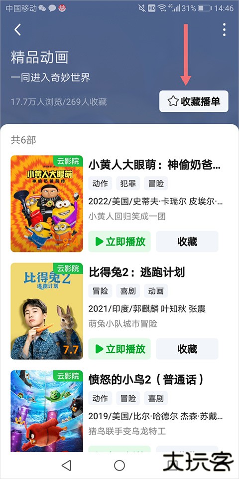 3、遇见心仪片子别犹豫!戳蓝色【立即播放】直接开看,点星星【收藏】存进个人片单。哟呵,页面顶部藏了个实用功能 —— 红色箭头指的【收藏播单】按钮,点一下就把整个分类专区打包收藏,下次追更省时省力。