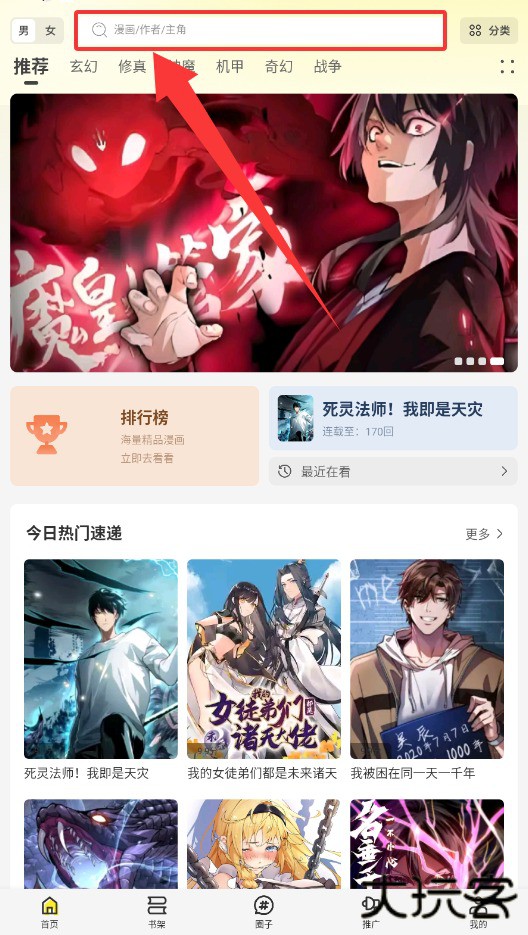 3、主界面搜索功能:进入主界面后,请定位顶部的搜索栏,输入目标漫画名称或相关关键词,即可快速检索并定位到所需作品。