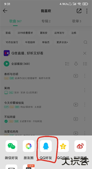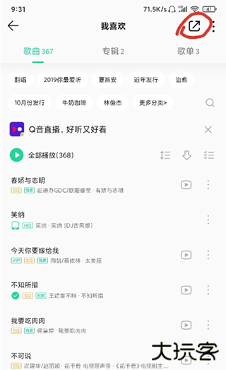1、启动 QQ 音乐应用,访问用户 "我喜欢的" 列表,点击右上角分享功能。