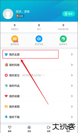 3、进入主题库界面后,把注意力移向页面右下角,那儿有代表你个人空间的图标(可能是个小人像),点点它。
