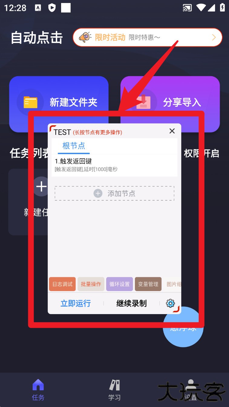 5. 流程制作完成后点击具体操作节点设置执行参数(如动作延迟时长、循环执行次数),之后可选择立刻运行任务或继续进行流程的录制扩展。