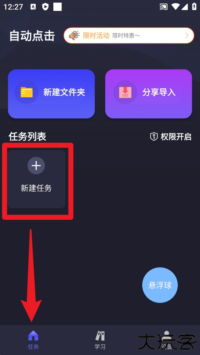 3. 返回主界面「任务」页面,选择「新建任务」开始进行屏幕操作的录制工作,定义并记录所需的自动化点击流程及内容。