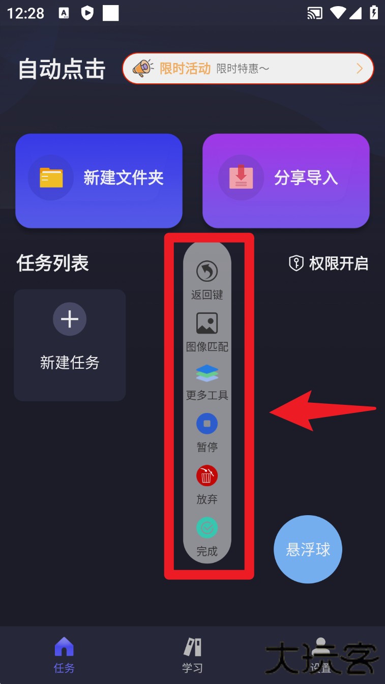 4. 在任务编辑页面中,通过左侧悬浮的功能工具栏,向流程中添加系统返回键、图像识别触发点、执行暂停等控制型指令。