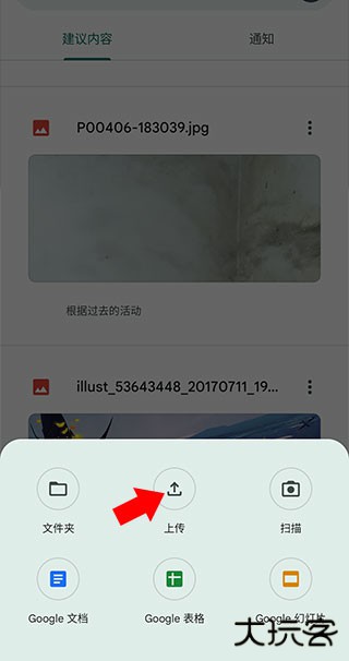 2、从底部弹窗选择【上传】功能,在设备存储中定位目标文件完成导入。