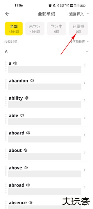 2、页面将跳转至单词列表界面。请在该界面中切换至「已掌握」栏目,点击「选词重学」功能按钮。随后,您可以从单词列表中选取需要重新学习的特定词汇,最终点击「重新学习」完成操作,所选单词将恢复至未掌握状态。
