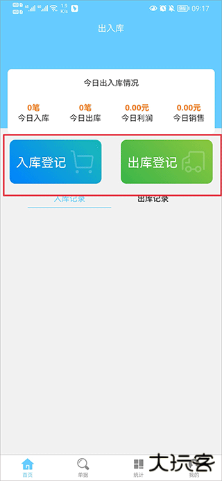 2、返回应用首页。根据需要执行的库存变动操作,于首页提供的功能选项中,明确选取 “入库登记” 或 “出库登记” 进入相应流程。