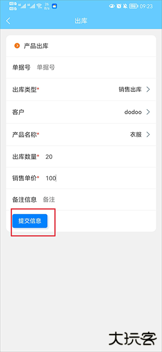 4、选择 “出库登记” 后进入操作界面。完整填写必填信息,包括:出库类型、产品名称、出库数量。确认信息无误后,点击 “提交信息” 完成本次出库操作。