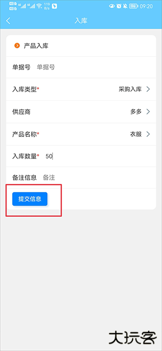 3、选择 “入库登记” 后进入操作界面。完整填写必填信息,包括:产品类型、产品名称、入库数量。确认信息无误后,点击 “提交信息” 完成本次入库操作。