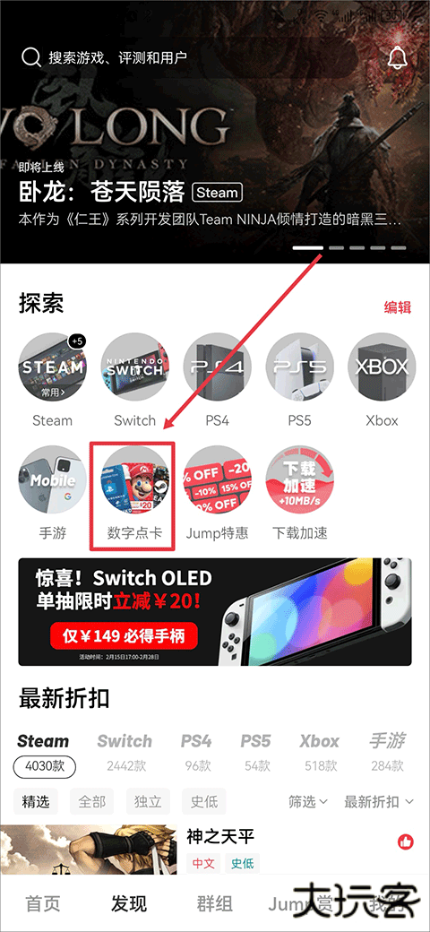 1、访问发现页面,选择 "数字点卡" 入口进入购买界面。