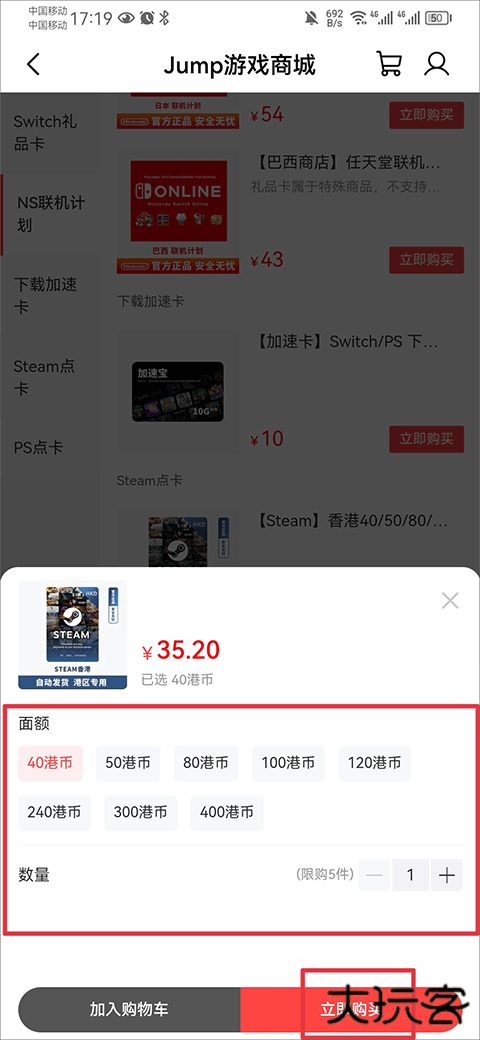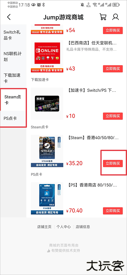 2、在商品分类导航区选择 "Steam 点卡" 或 "PlayStation 点卡" 品类,随后点击对应商品的 "立即购买" 按钮。