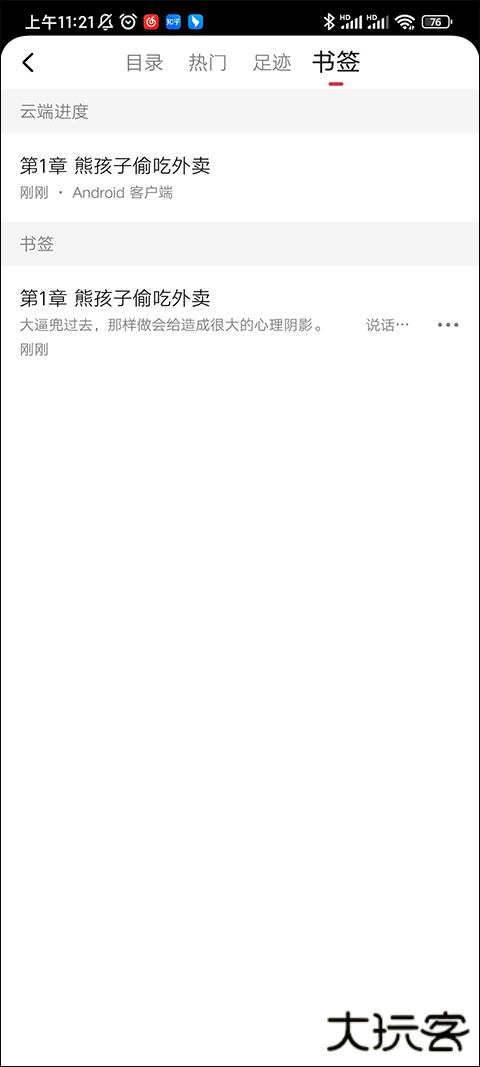 4、成功时页面将闪现 "书签已添加" 提示,同时正文右上角出现浅色角标。通过目录页进入「书签」标签页,可集中管理所有标记内容。