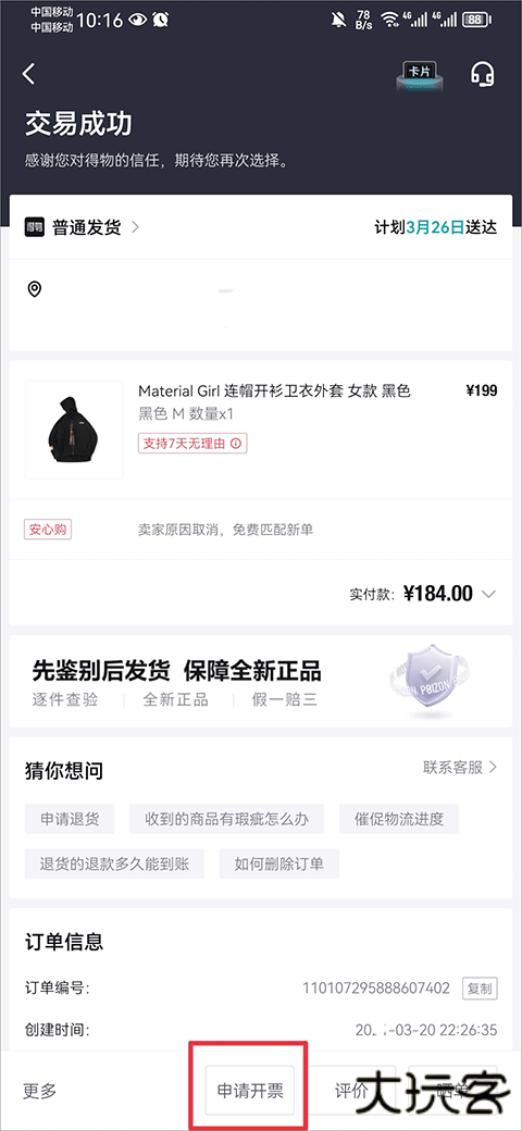 3、于订单详情页底部操作区点击「申请开票」功能按键,激活发票申请流程。