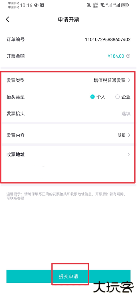 4、依据要求填写发票抬头信息(个人 / 企业)、选择发票类型(电子 / 纸质),并完整填写接收地址等必要信息。信息核验无误后,点击「提交申请」完成操作。