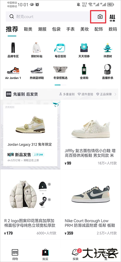 1、启动得物 App,进入购买相关页面,找到并轻触搜索框右侧的相机图标按钮。