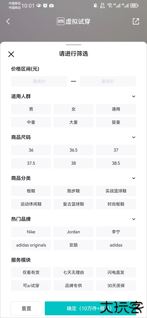 4、在试穿过程中或鞋款浏览界面中,寻找位于录屏功能按键旁边的筛选按钮并点击它。通过此筛选器,您可以根据个人需求设定条件,例如商品价格范围、品牌归属、鞋码大小以及特定的鞋履类型等,快速定位到最符合要求的鞋款进行试穿。