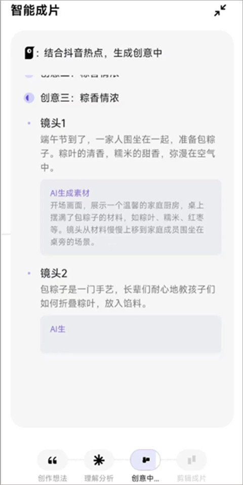 选择“智能成片”,在对话框输入想做的内容,比如“端午节一家人包粽子”