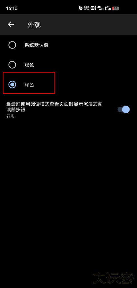 3、于外观设置中启用 "深色模式" 功能即可切换至夜间界面;