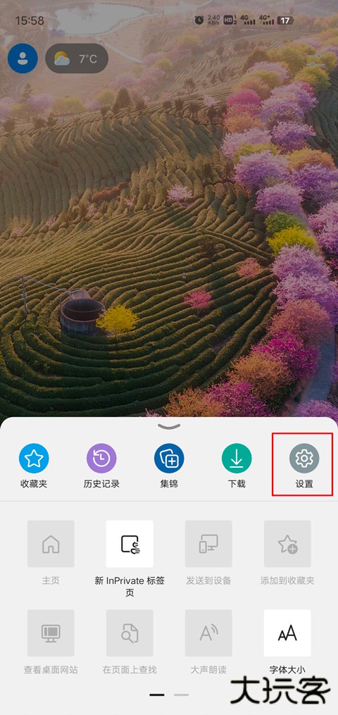 1、启动 Edge 浏览器安卓版,点击底部导航栏中部的≡按钮展开菜单,选择 "设置" 选项进入配置中心;