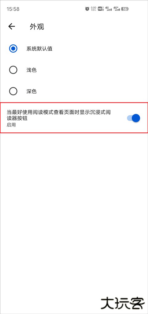 4、启用 "显示沉浸式阅读器" 功能开关以激活该特性。