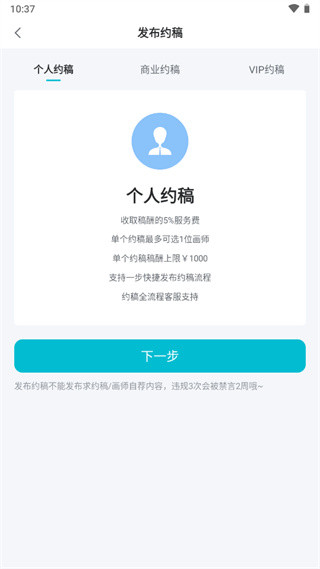 3、选择约稿种类,点击下一步;