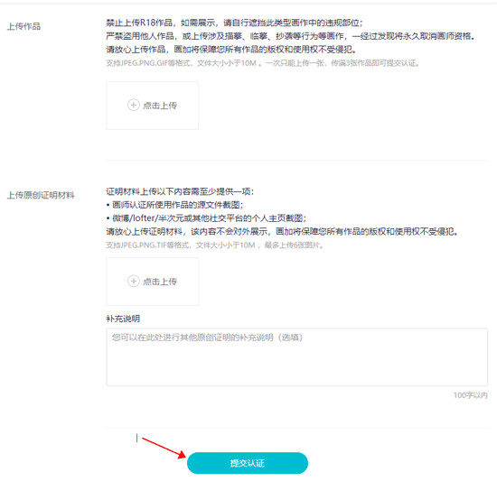 3、接着在认证页面填写个人信息以及作品,提交认证后等待官网认证信息的回复。
