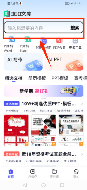 360文库,一个线上学习办公搭子,内置上亿款文档资源,涵盖学习与办公全场景,文档资源分类还超详细,大家能直接搜索想要的文档,下载并使用。软件还接入了deepseek等众多ai大模型,能帮助大家一键生成文案、PPT等,是一个既能写又能下的综合性手机文档神器。