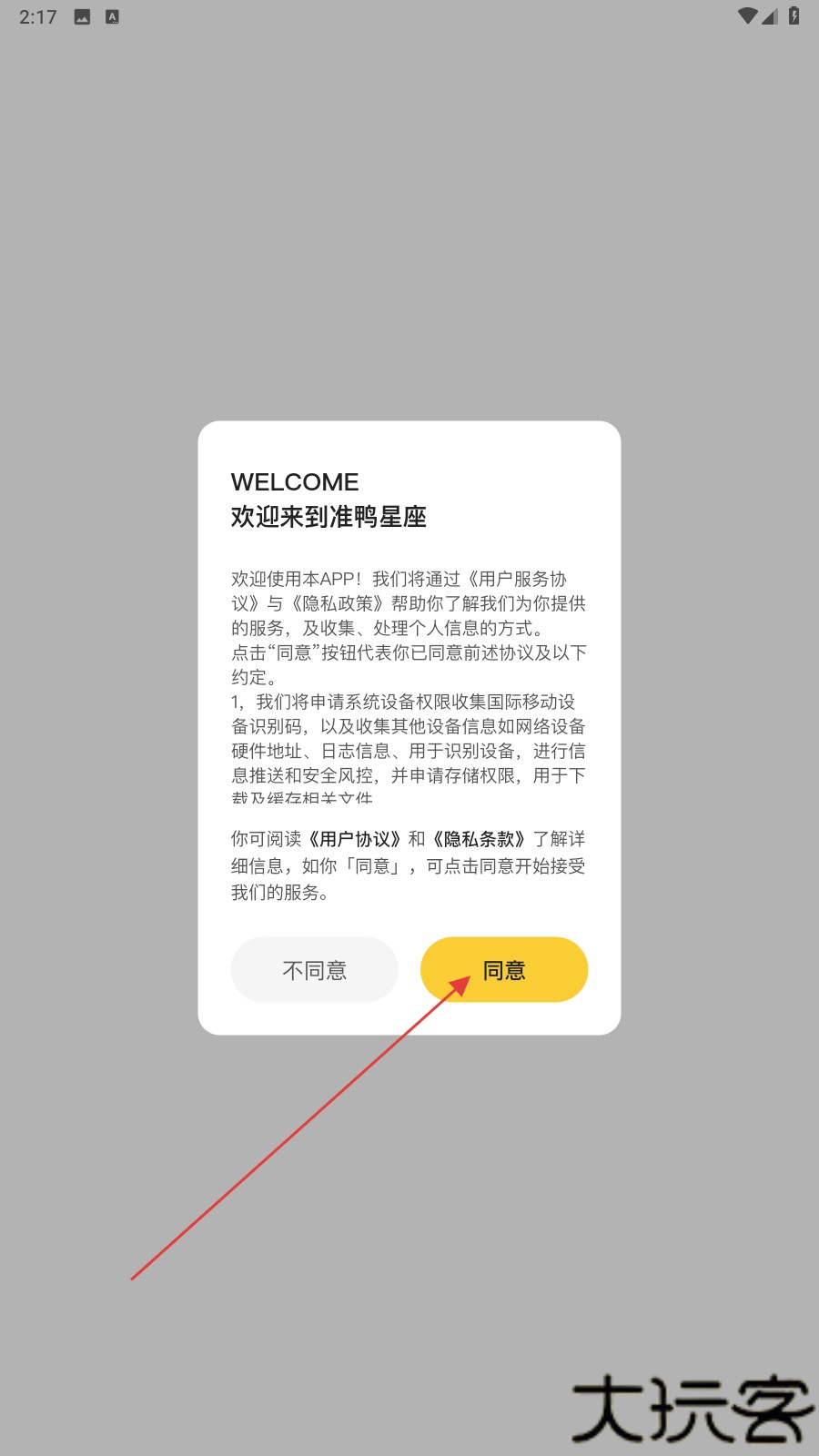 1、打开进入准鸭星座app后,用户需阅读协议与隐私政策并且同意。