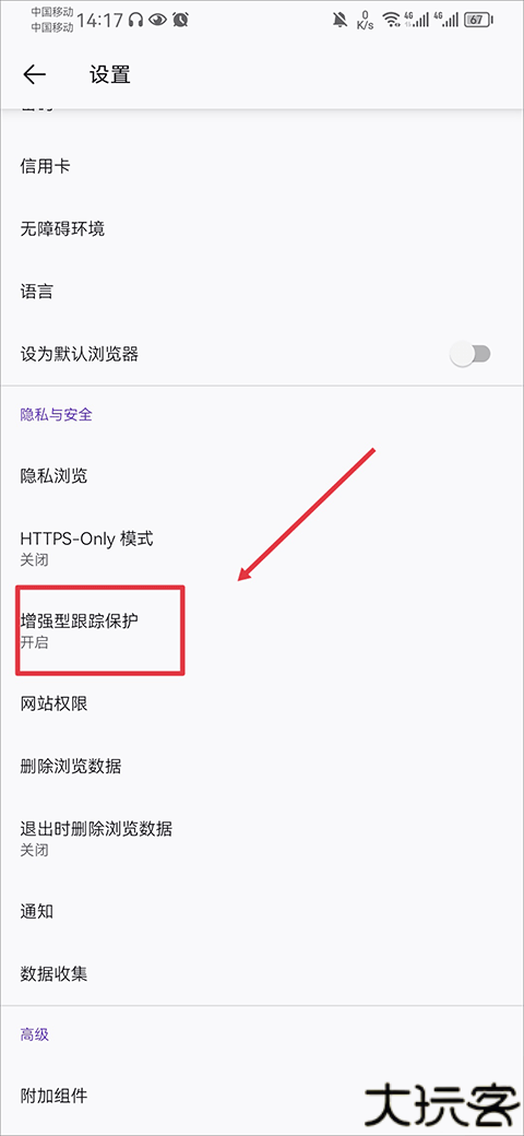 3、在设置界面中,点击隐私与安全,再接着点击增强型跟踪保护。