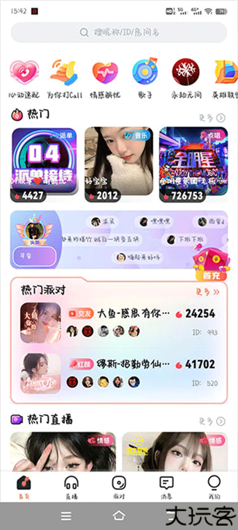 2、首页的顶部可以让用户快捷进入不同主题的语音聊天室、热门派对以及直播页面。