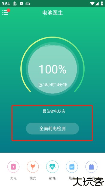 点击电量检测,快速查看耗电分析与充电进度。