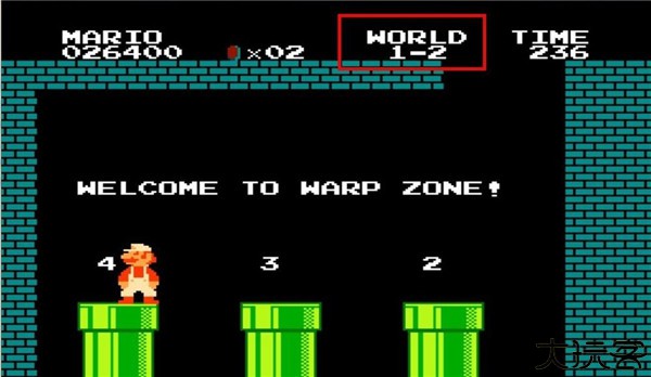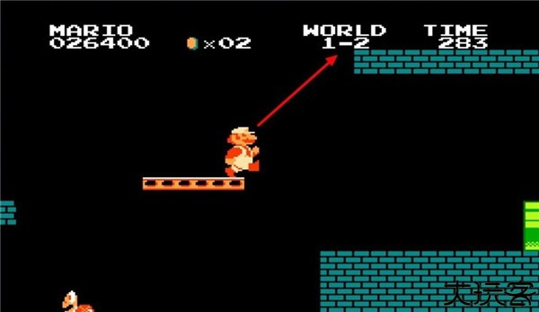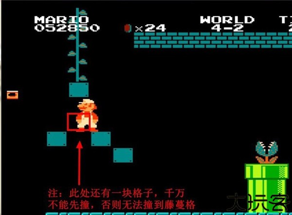 6、玩家爬上藤蔓到达4-2关卡的尽头之后,会再次出现3个水管入口,分别表示第6,第7和第8关,玩家选择8这个入口进去。