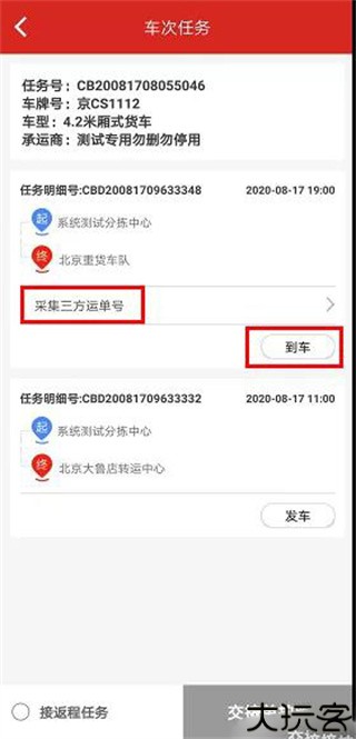 6、扫描或手填运单编号,点击“到车”完成到达确认。