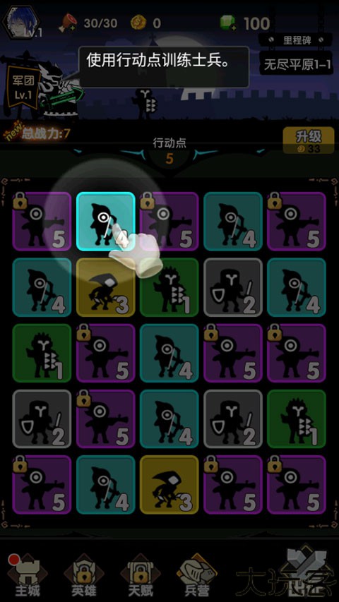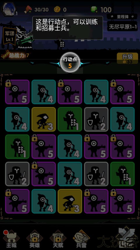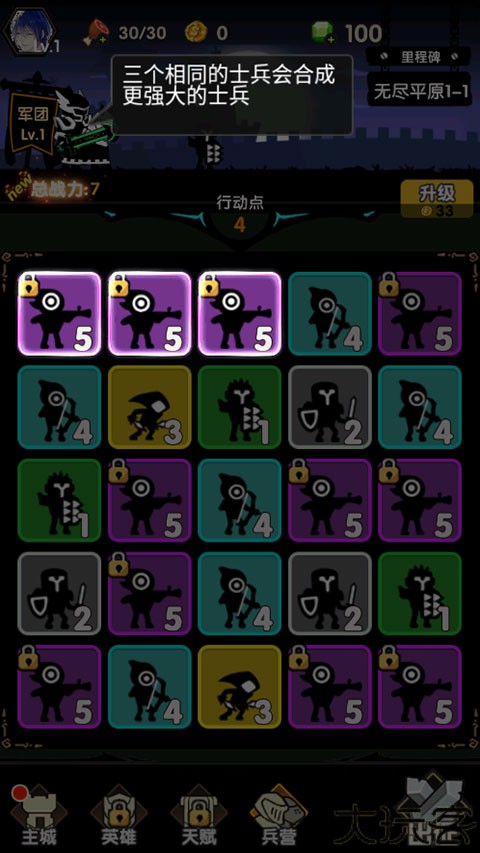 3、4级士兵经过训练会变成5级士兵,三个5级的兵会合成为更强大的士兵。