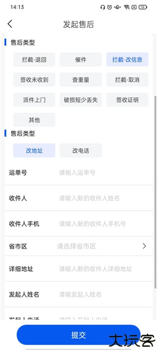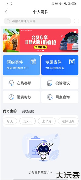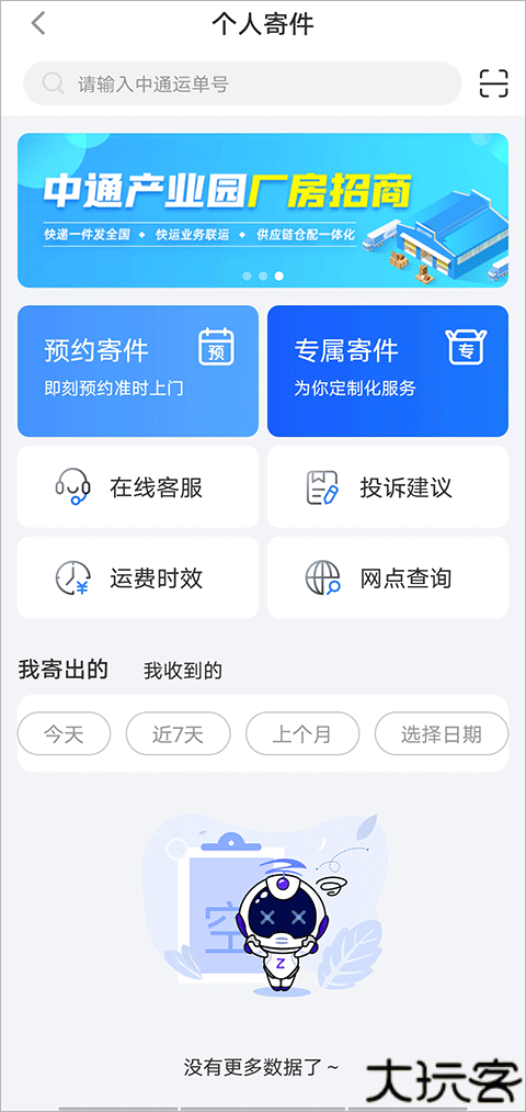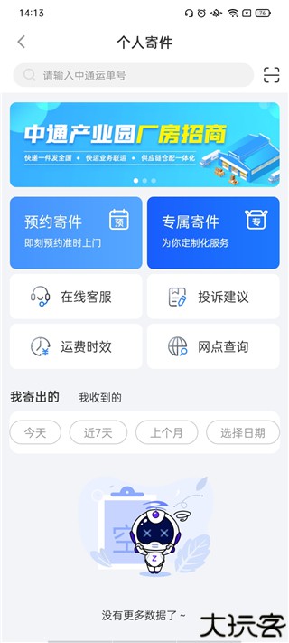 6、个人寄件中支持预约寄件、网点查询、投诉建议等信息。