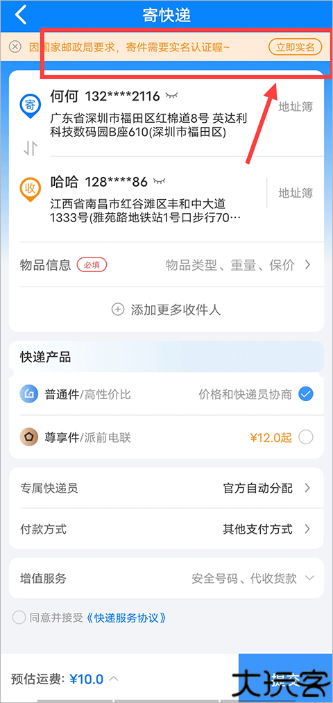 1、在中通快递app上寄件前提需要完成实名认证才可以,然后填写正确的收发件人,点击提交就可以了。