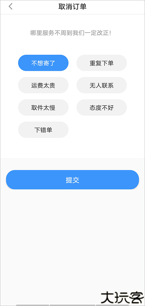 2、如果快递员还没上门取件,可以在订单界面点击“取消订单”,选择一个取消原因,具体由实际情况选择。最后点击提交这样就可以成功取消订单了。