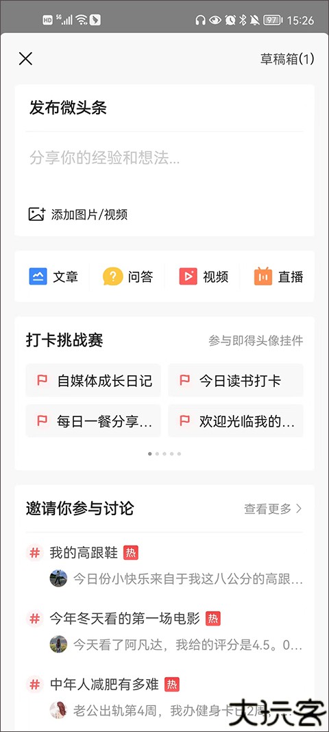 1、点击右上角+号可进入文章发布,还能发视频、小视频及问答。