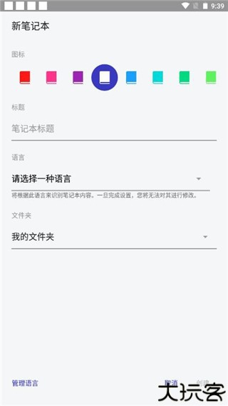 4、选择新建笔记在去输入标题、颜色、语言等,点击创建。