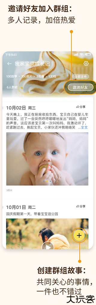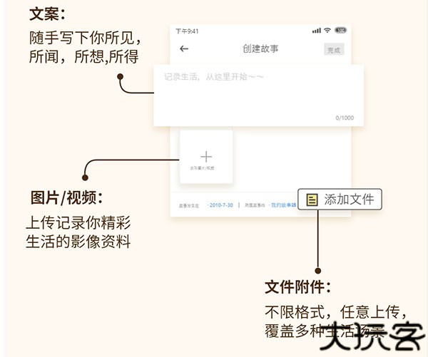 支持上传图片、视频、音频、文件、心情描述等,帮玩家全面谱写人生故事。