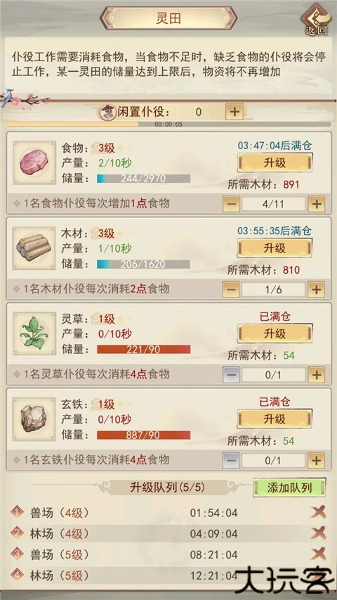 4、灵草木材食材可设为自动升级,强化日常资源获取。
